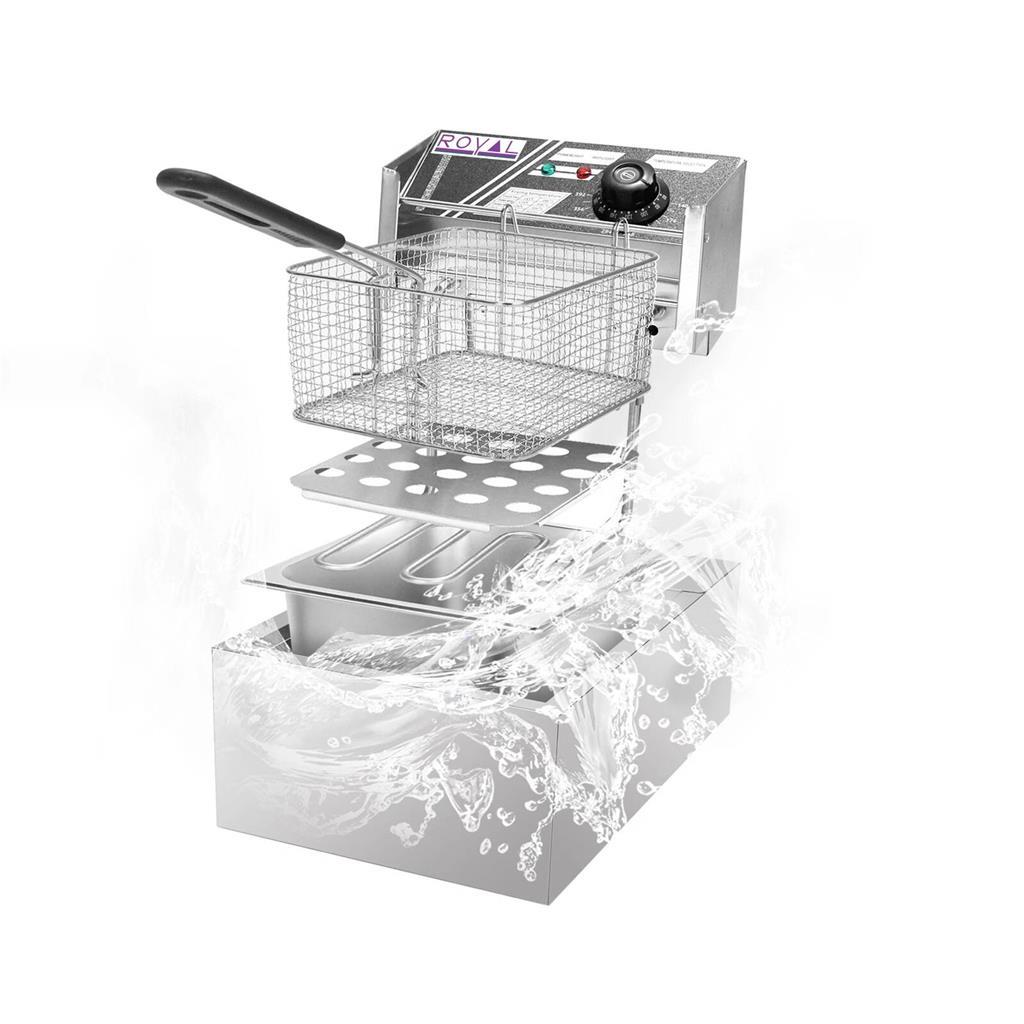 Die 8-Liter-Fritteuse ist für anspruchsvollere, professionelle Anwender konzipiert. Gehäuse und Ölbehälter der Fritteuse bestehen aus Edelstahl (18/0), und zur einfacheren Reinigung kann der Ölbehälter abgenommen werden. Die Fritteuse verfügt außerdem über einen abnehmbaren Korb und einen Behälterdeckel. Der abnehmbare Korb hat einen langen, wärmeisolierten Griff für einfaches Handling bei hohen Temperaturen.