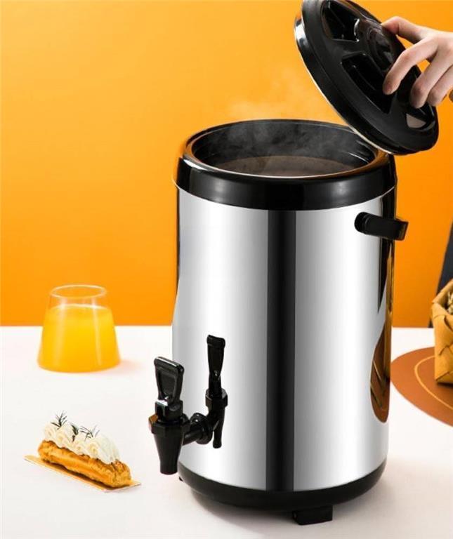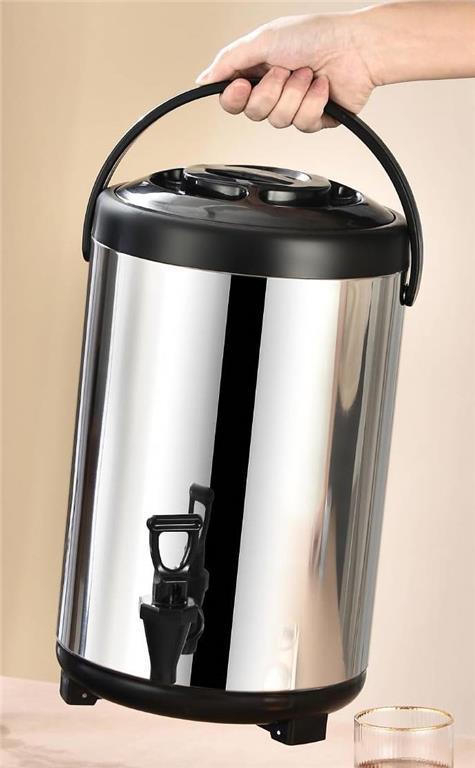 Thermobecher mit Zapfhahn für einfaches Ausgießen, 10l Fassungsvermögen und robustem Edelstahlgehäuse. Der Becher verfügt über einen Tragegriff und ein Tropfschutzsystem.