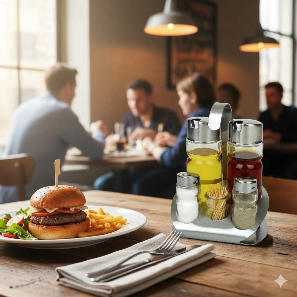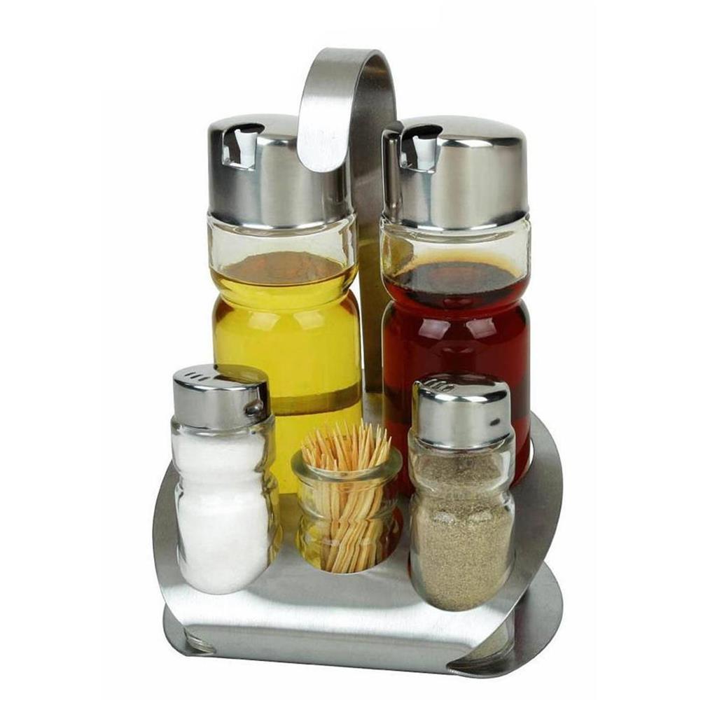 Das Gewürzset mit Salz, Pfeffer, Öl, Essig und Zahnstochern ist eine unverzichtbare Ergänzung für jeden Tisch – vor allem wegen seines günstigen Preises.