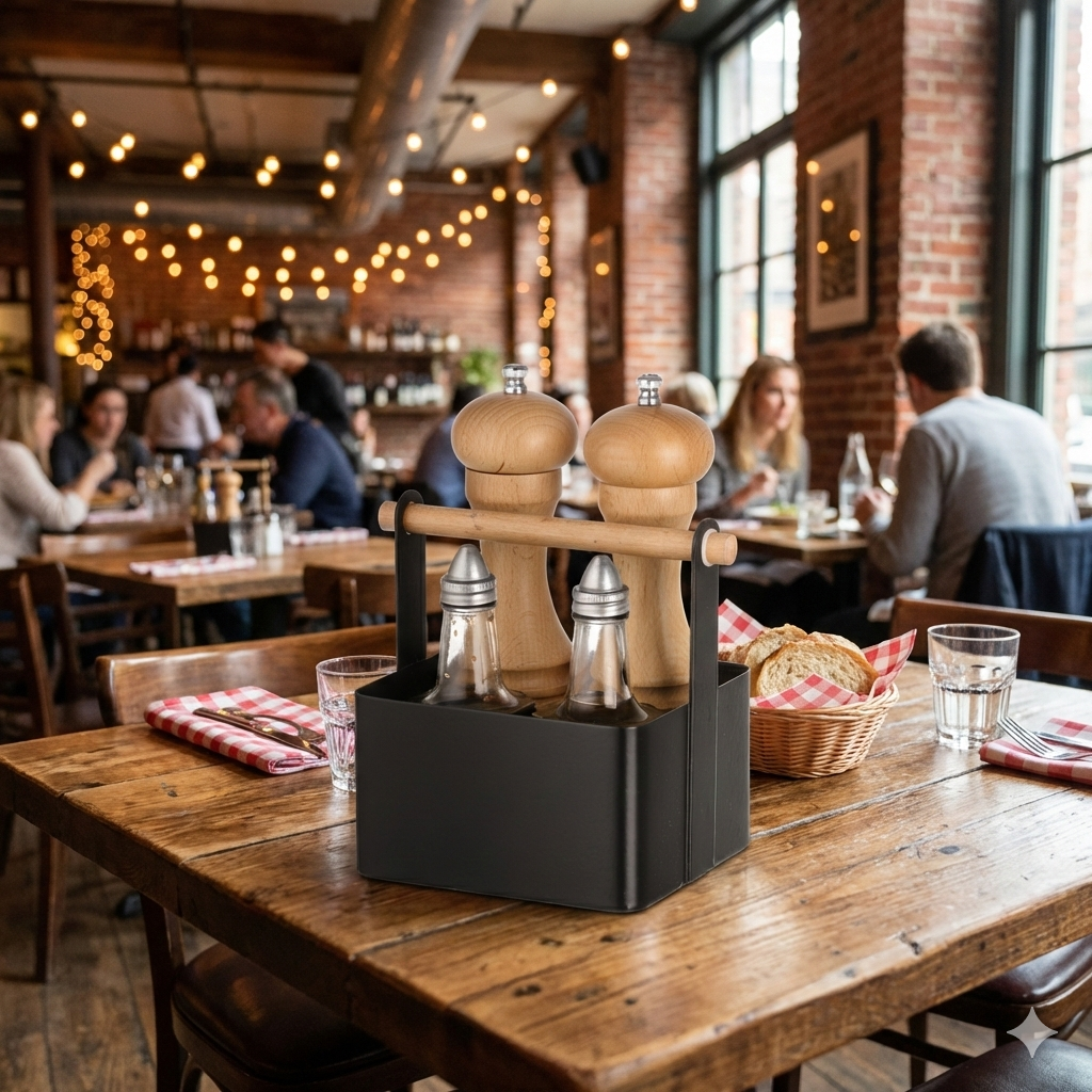 Das vierteilige Table Cady Set für Öl, Essig, Salz und Pfeffer von HENDI ist eine unverzichtbare Ergänzung für jeden Tisch – allein schon wegen seines günstigen Preises und der guten Qualität.