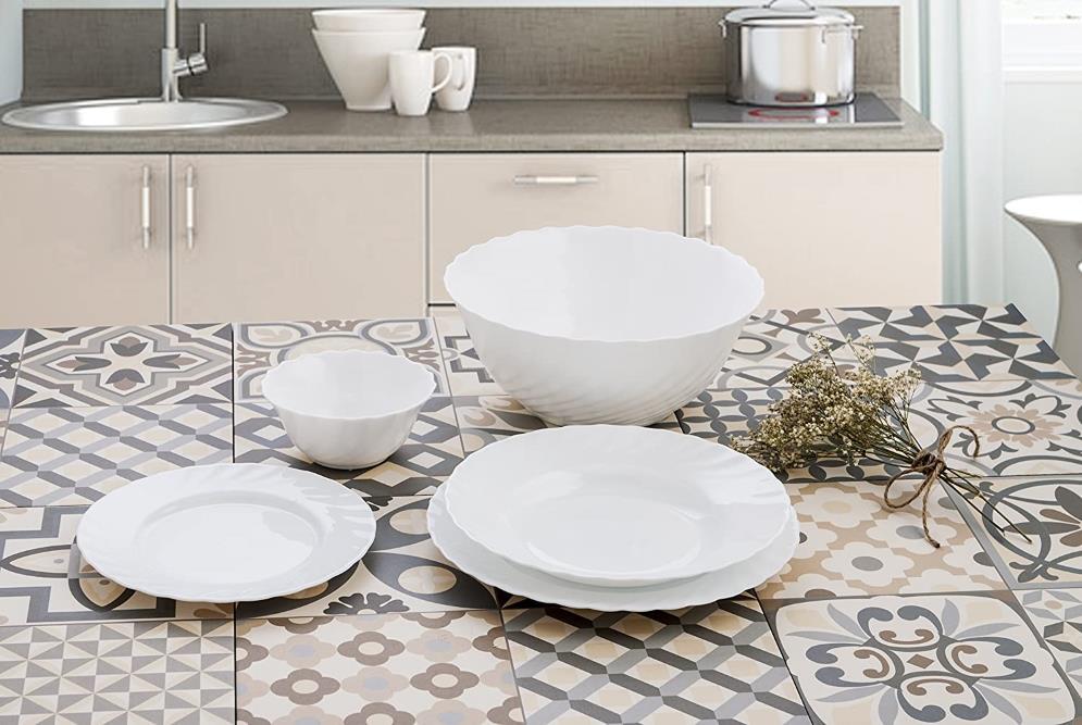 Das Produkt wird aus Opalglas in einem Verfahren hergestellt, bei dem dem Glas weiße Farbe beigemischt wird. Im Vergleich zu einem Porzellanprodukt gleicher Größe hat es eine geringere Masse und die Kanten sind weniger spröde.
