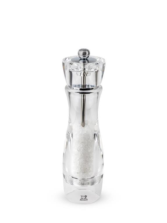 Die klaren und schlanken Linien der Vittel-Salzmühle harmonieren perfekt mit den beiden Materialien. Transparentes Acrylgehäuse und Metallzubehör sowie Verzierungen an den Seiten und am Kopf der Mühle. Diese besondere Kombination macht die Vittel-Mühle einzigartig und sofort erkennbar. Auf dem Tisch sind Inhalt und Salzmenge gut sichtbar. Die Vittel ist aber nicht nur wunderschön, sondern auch technologisch hochentwickelt. Ausgestattet mit einem Peugeot-Salzmahlwerk und lebenslanger Garantie wird diese Mühle jeden Feinschmecker begeistern. Mit dem Drehknopf am Kopf der Mühle kann der Benutzer den Mahlgrad einfach bestimmen.