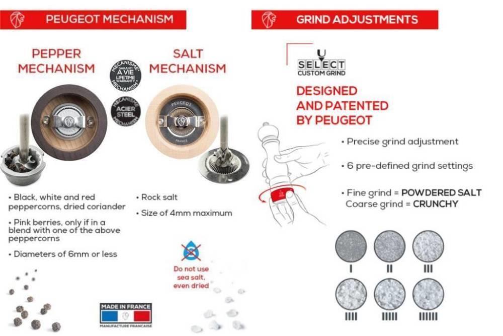 Peugeot-Mühlen zeichnen sich durch spezielle Mechanismen aus, die automatisch mahlen. Mit seinen Mühlen ist Peugeot zu einem unverzichtbaren Accessoire für alle gehobenen Küchen und Gourmetecken geworden, da die spezielle Mahlmethode eine optimale Nutzung der gemahlenen Gewürze ermöglicht und deren Duft und Geschmack vollständig bewahrt.