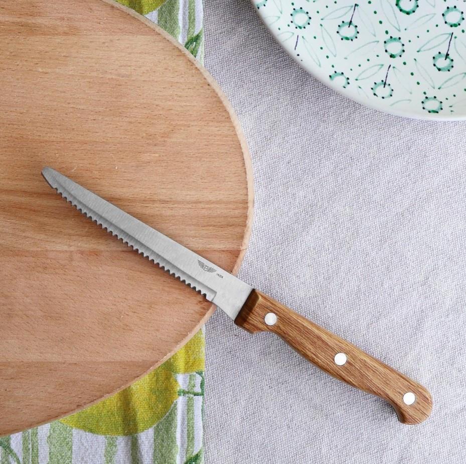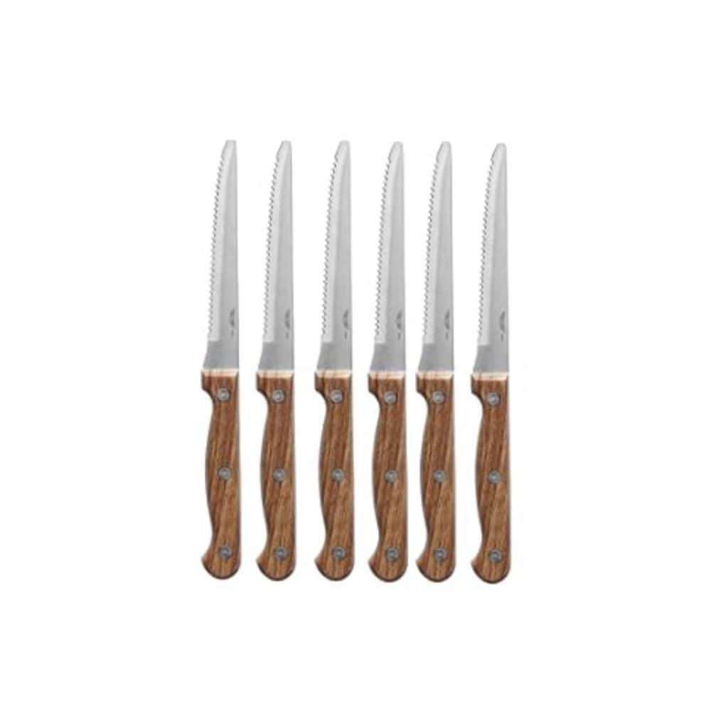 Das Messer mit Griff in Holzoptik, erhältlich im 6er-Set, 22 cm lang und spülmaschinenfest, ist die perfekte Wahl zum Schneiden von Steaks, Pizza und ähnlichen Gerichten.