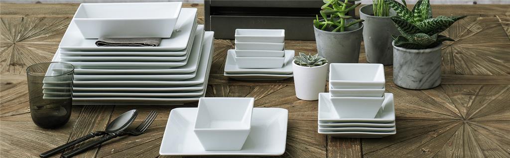 Mit ihrer ungewöhnlichen eckigen Form verleihen die Teller und Schüsseln der Linie Merid Ihrem Service eine besondere Note, bleiben aber dennoch im traditionellen Weißton.