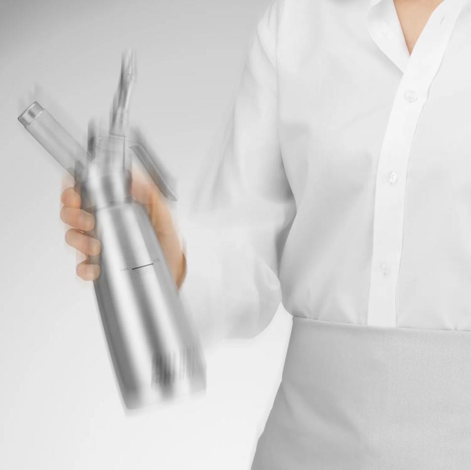 Sahnespender und Spenderflasche Mosa Master Whip aus Edelstahl zur Zubereitung von Sahne und cremigen Texturen.